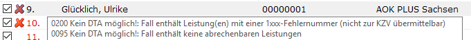 Es liegen Fehlermeldungen des Prüfmoduls vor, welche den Datenträgeraustausch verhindern „Kein DTA …“, die sich nicht auf das Lesen der eGK, sondern auf die erfassten Leistungen beziehen:
