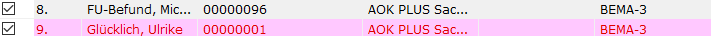 Durch Eingabe eines Behandlers in der Leistungserfassung (bedingt durch die Übergabe der Zahnarztnummer) werden diese Patienten im Prüflauf mit rosa Farbe hinterlegt: