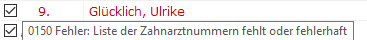 Bei Patienten, wo diese Meldung in den Prüfläufen zur Quartalsabrechnung bzw. in den Einreichungen ZE, KBR, PAR erscheint, fehlt die Eingabe eines Behandlers an mind. einer Leistung mit hinterlegter Zahnarztnummer.